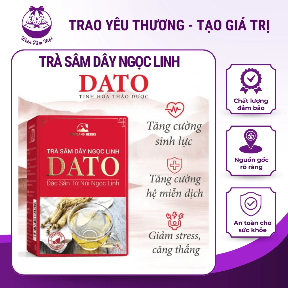 Trà sâm dây Ngọc Linh DATO được đóng gói 50g gồm 25 gói x 2g. Dạng túi lọc thuận tiện sử dụng, chỉ cần cho gói trà vào 200ml nước sôi, chờ 3-5 phút là dùng được. Có thể sử dụng nóng hoặc lạnh và kết hợp với chanh, xí muội, cam thảo… để tạo ra các hương vị khác nhau. Sử dụng sâm dây Ngọc Linh thường xuyên giúp tăng cường hệ miễn dịch, giảm cholesterol, chống lão hoá, giảm căng thẳng, ăn ngon ngủ ngon.